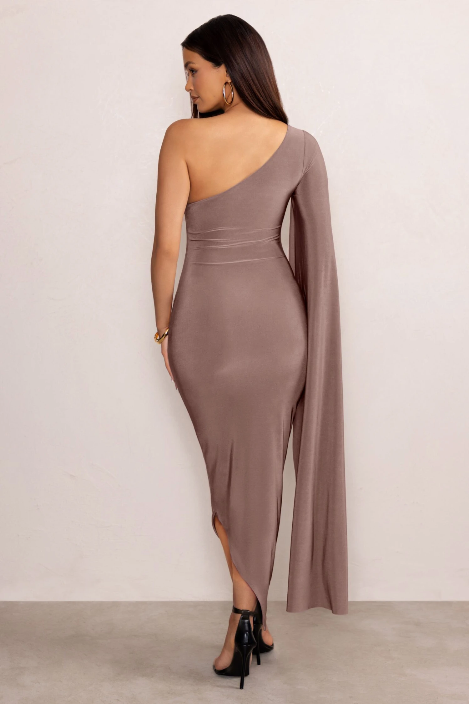 Aliana | Mocha Asymmetric Midi Dress With Cape Sleeve
