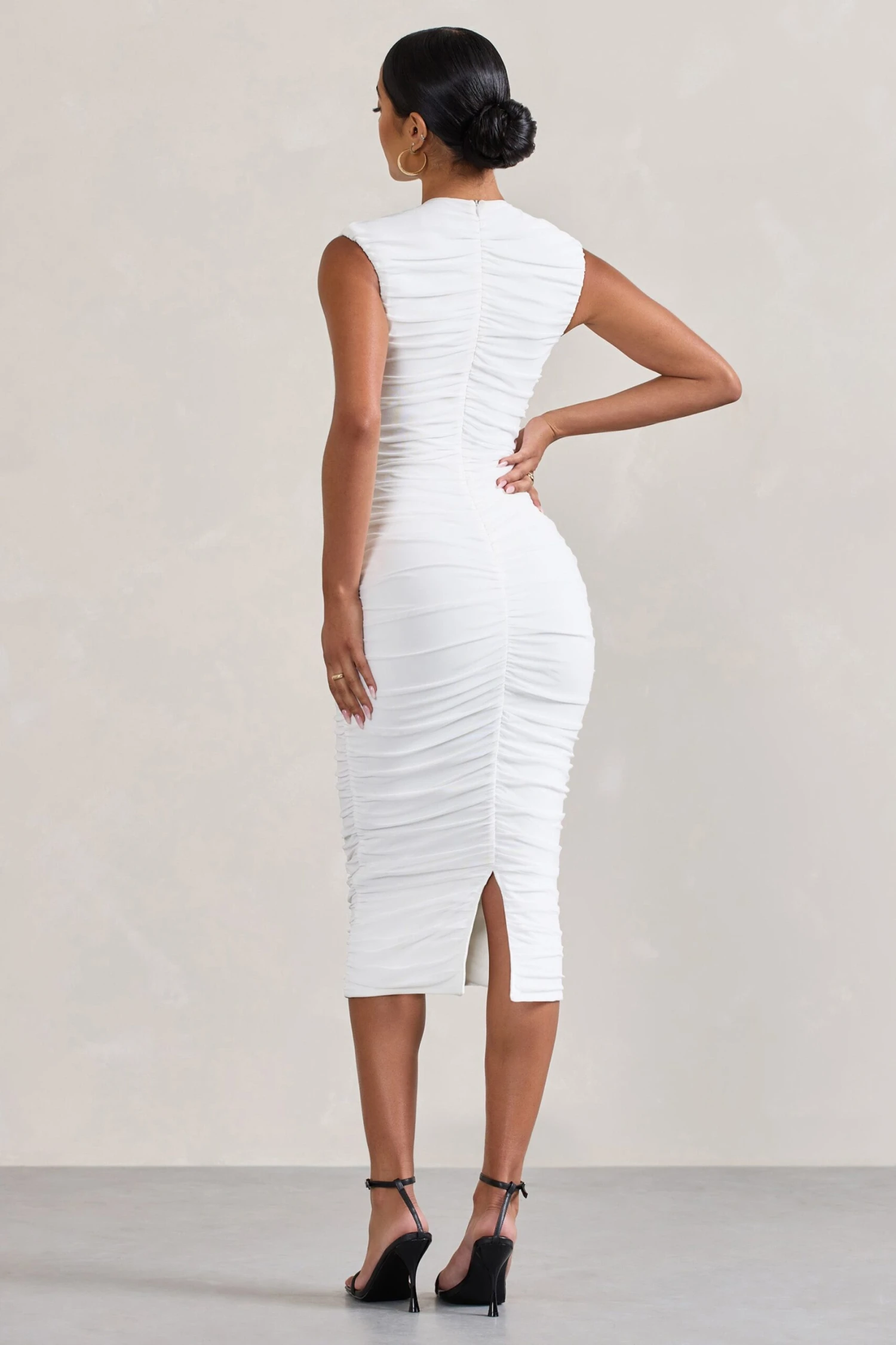 Bring an element of class to any occasion in our white mesh midi Alight. Designed in our premium stretch jersey, this sleeveless dress features a rounded neckline and softly- ruched panels. This desirable piece is a great option for your next dinner date or a work night-out.