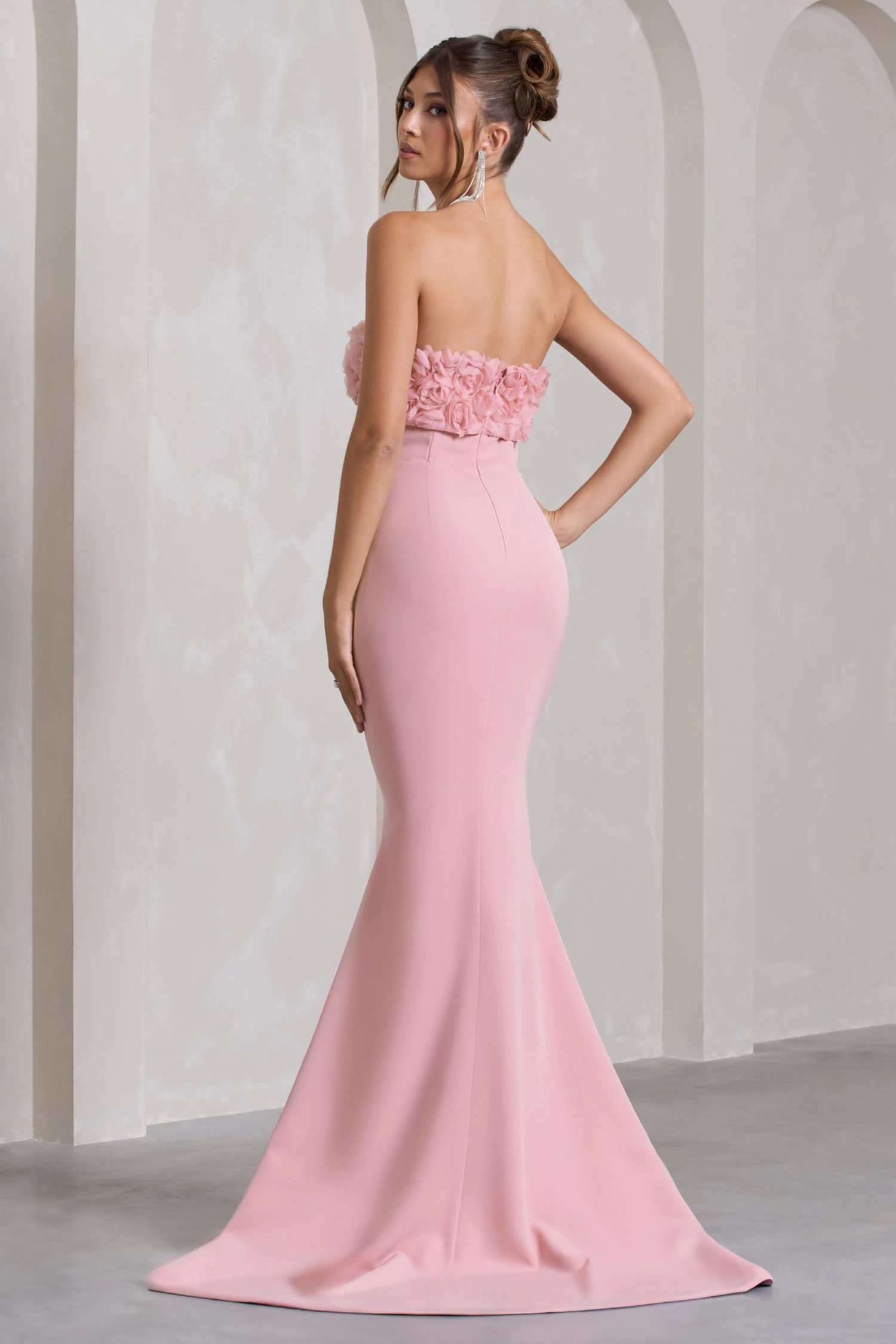 A feminine style designed for black tie evenings, Allegra has everything you need to make a lasting impression at your next event. Arriving in a soft pink hue of our signature stretch crepe, this captivating maxi dress is defined by a floral bandeau neckline and high-leg split. For the perfect prom ensemble, try styling Allegra with some statement earrings and strappy stilettos like Sweet Step.Â