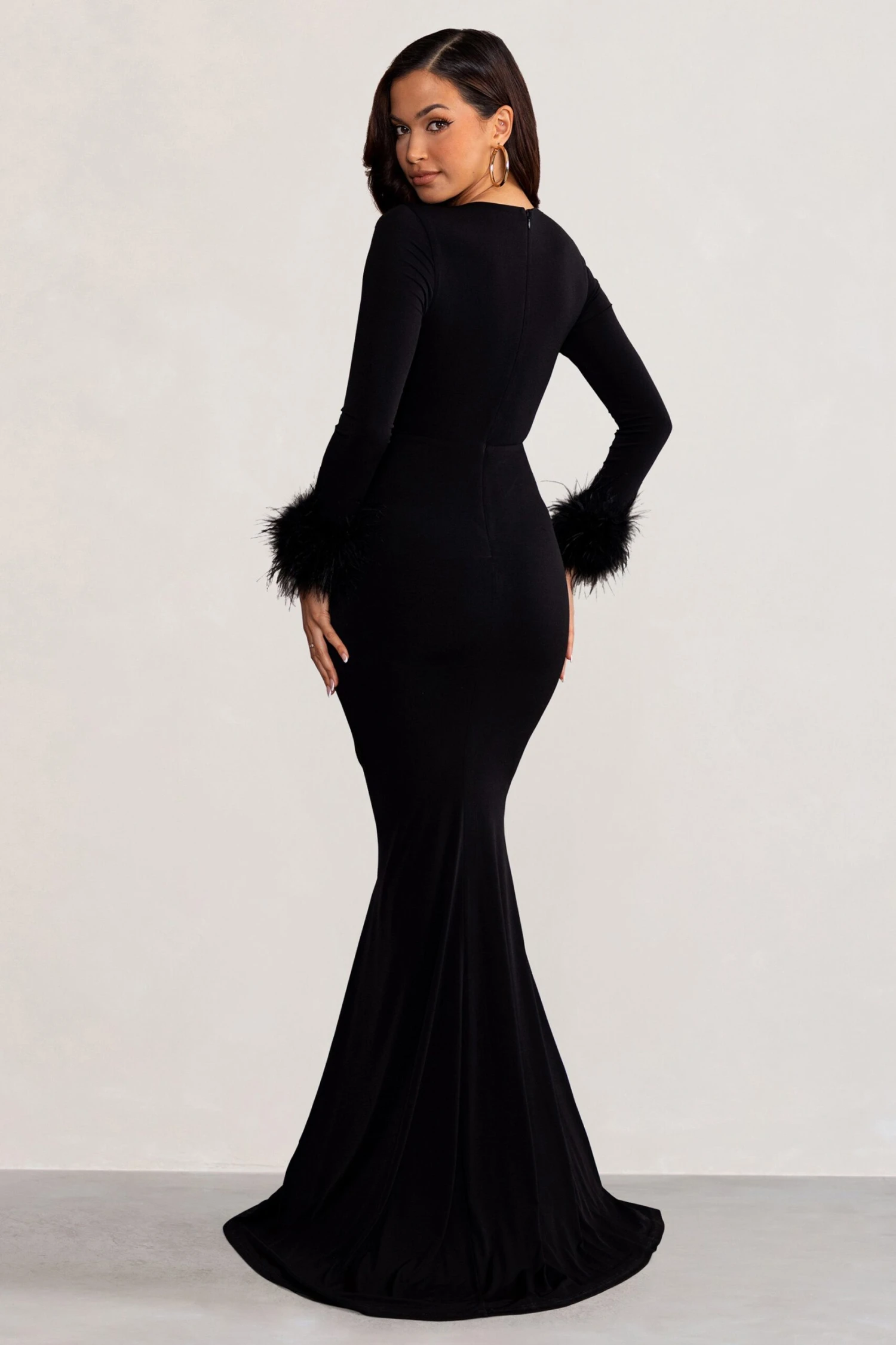 If you’re falling for all things feathered this season then you will love our latest black maxi dress, Betty. Crafted from premium stretch jersey, this figure-hugging dress features a high neckline, long sleeves trimmed in feathers and a fishtail skirt that’s anything but understated.