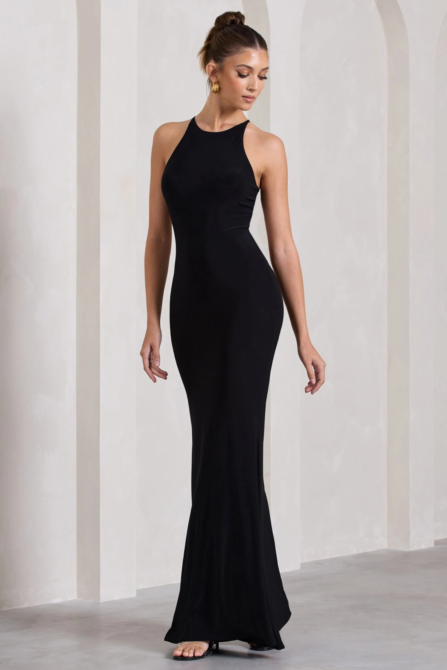 Defined by an irresistible open-back, Brianna puts a contemporary twist on this otherwise timeless silhouette. This halter-neck maxi dress arrives in a classic black shade of our signature stretch jersey, renowned for its figure-sculpting capabilities. For an elevated wedding guest look, try complimenting Brianna with gold accents.Â