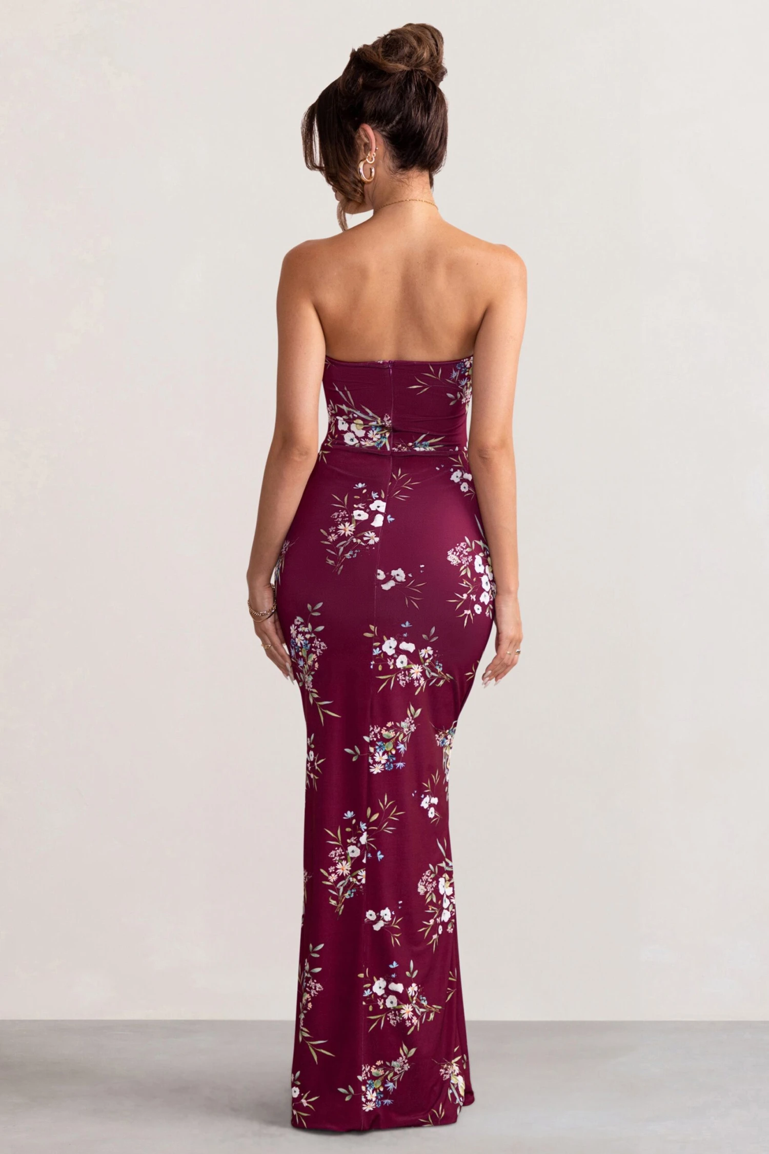 Boasting a sleek strapless silhouette, Camila is the sophisticated maxi dress suited to every special occasion. This luxurious evening option arrives in a florally-printed stretch jersey that’s designed to contour your curves with ease. Finished with a striking thigh split, this burgundy bodycon dress would look especially elegant styled with tousled hair and understated heels.