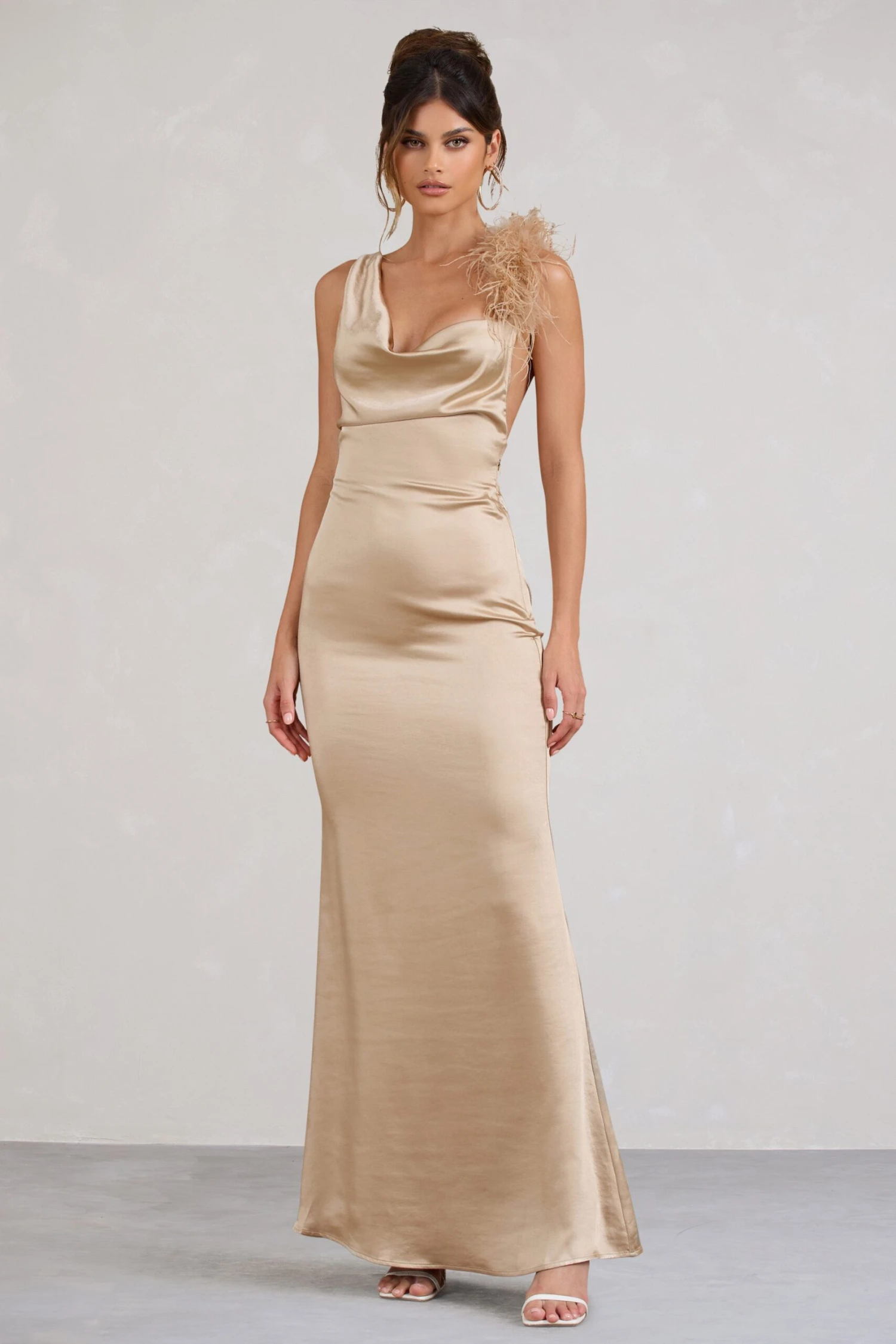 Whether you’re curating pieces to see you through summer or winter occasions, this asymmetric maxi dress is one to be cherished. Warm gold satin is artfully draped to shape a slinky cowl-necked silhouette. A floral strap adds a bold but beautiful final touch to Cherish Me.