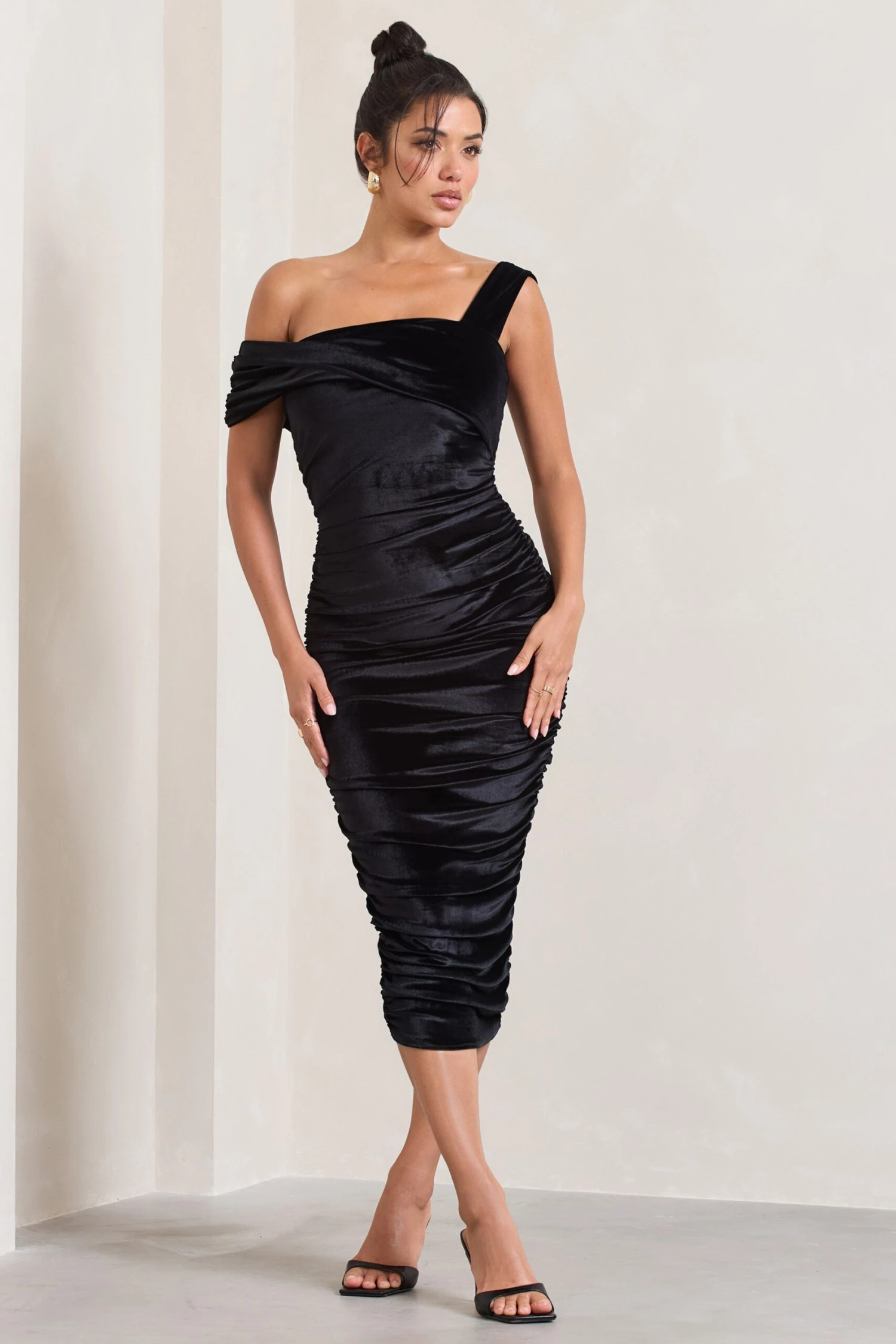 Make a statement in Daniela. Designed in our luxe black velvet fabric to contour your hourglass figure and featuring a one-shoulder Bardot design to complement your decolletage, this dress is a classic. The midi cut and figure-hugging design perfectly balances modesty with understated glamour. Timeless and chic, Daniela is the perfect dress for any black tie or formal occasion. Turn heads at your next event in Daniela.