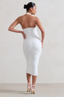 From grand weddings to graduations, your figure deserves to shine in this aptly-named showstopper. Designed in premium weighted satin, our Deserving midi dress arrives in a classic wrap silhouette with a draped Bardot neckline and a boned bodice. Pair this cream dress with strappy stilettos and gold hoops for a fine bridal look.
