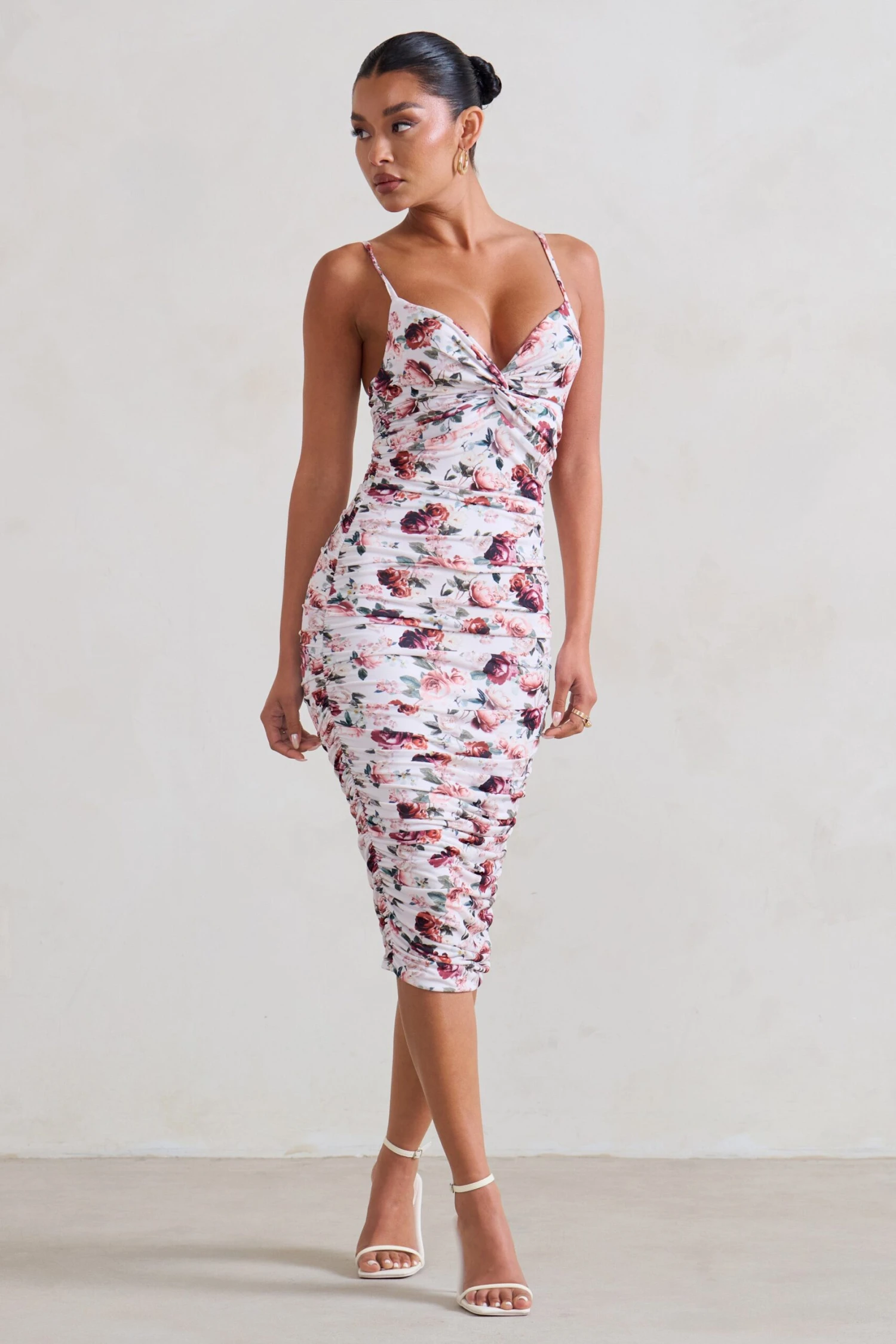 Give your wardrobe the refresh it deserves with our white floral favourite, Desired. Perfect for evening cocktails or a bottomless birthday brunch, this dress arrives in a sweetheart silhouette with slim straps, a twisted knot detail and ruching that brings attention to your curves. Pair this printed midi dress with strappy heels for a minimal look with maximum impact.