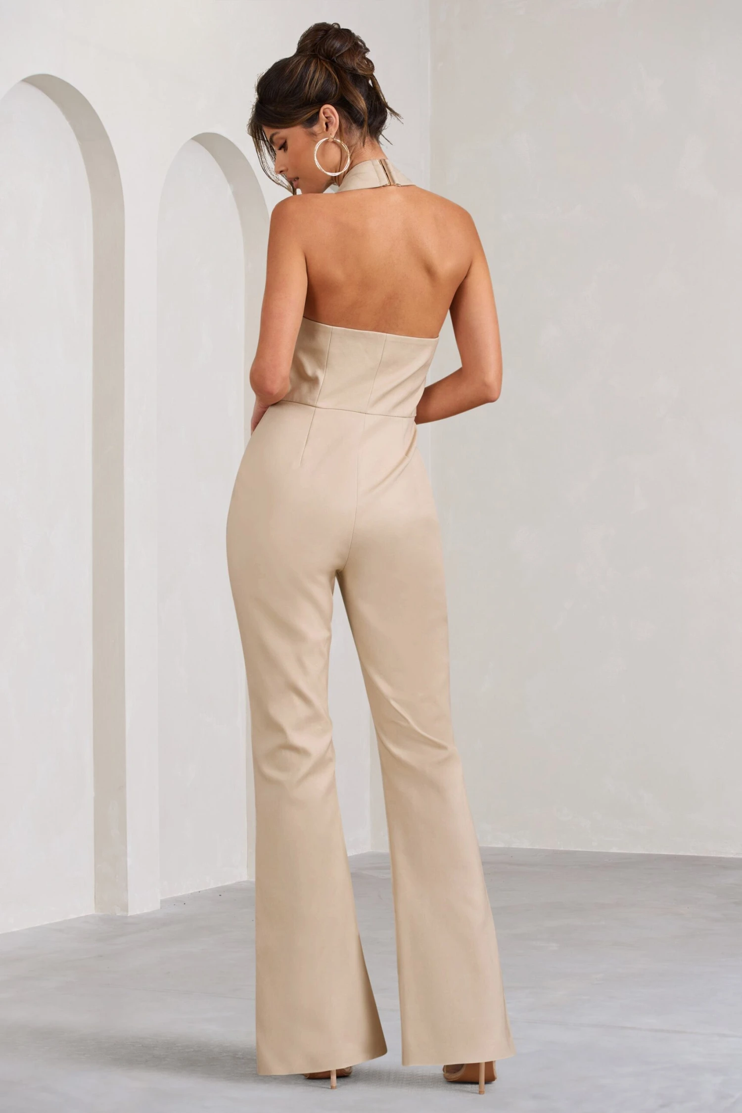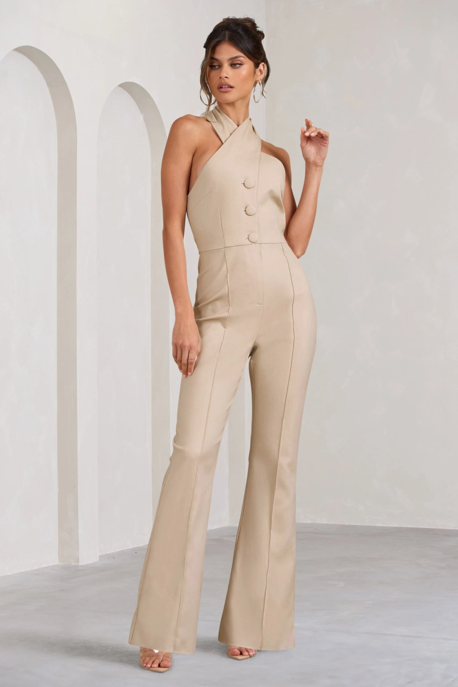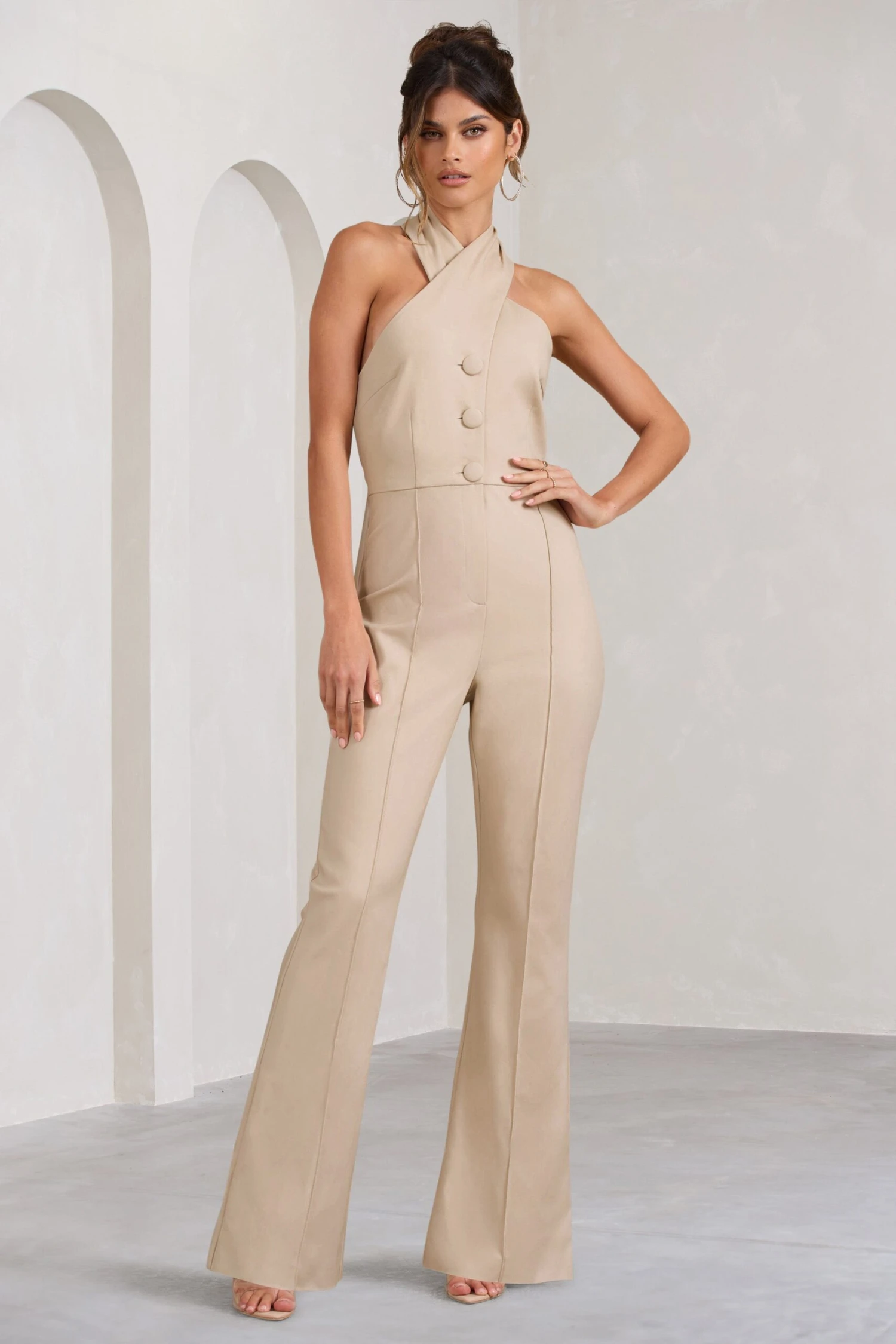 Don’t Cross Me | Stone Halter Neck Tailored Buttoned Sleeveless Jumpsuit