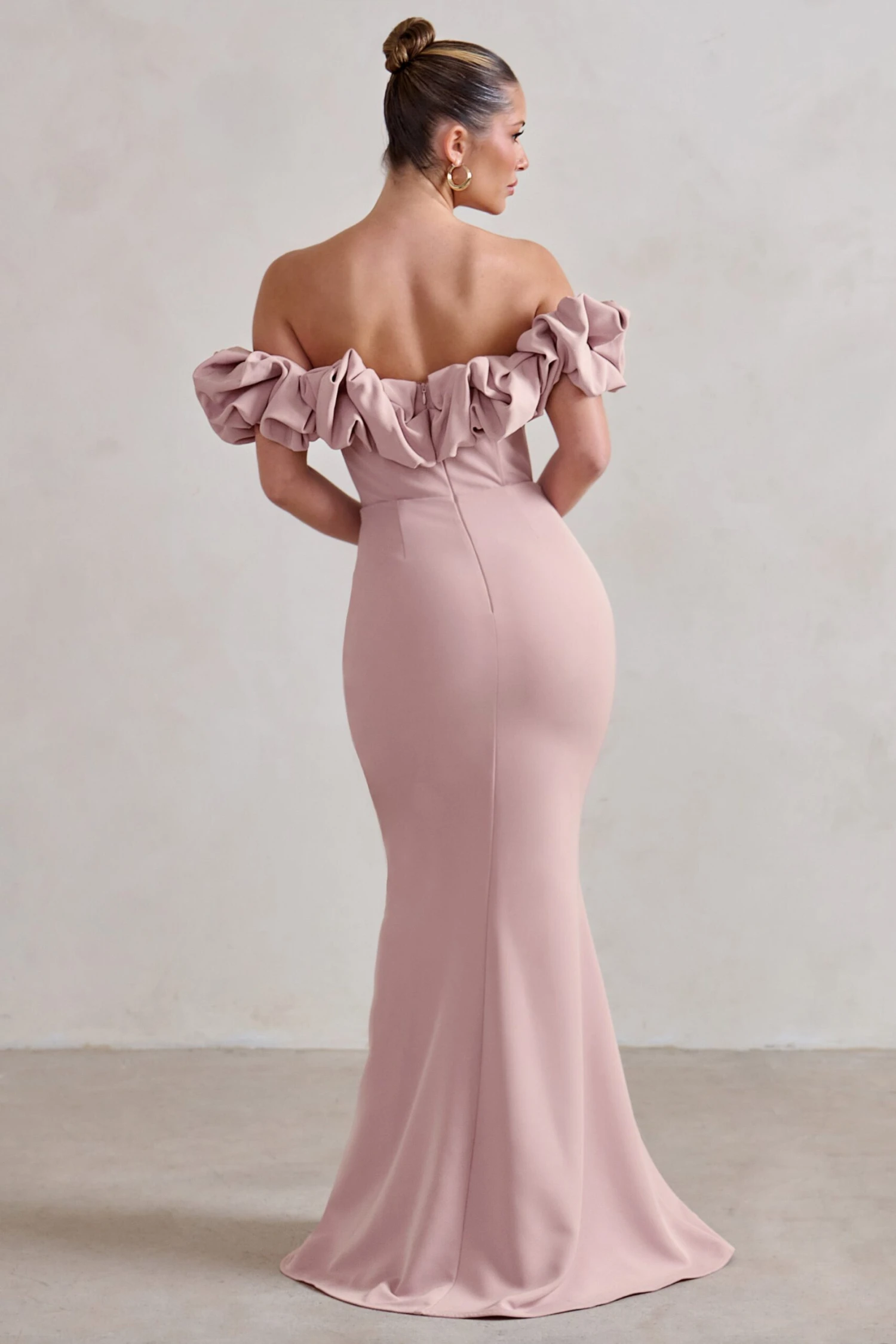A fine trim of voluminous ruffles makes this short-sleeved maxi dress truly unforgettable. Perfect for bridesmaids or an upcoming birthday, our Esmeralda boasts a Bardot silhouette made from blush pink crepe with darts to define your waistline. More darts shape a floor-sweeping skirt which also features a striking side split.