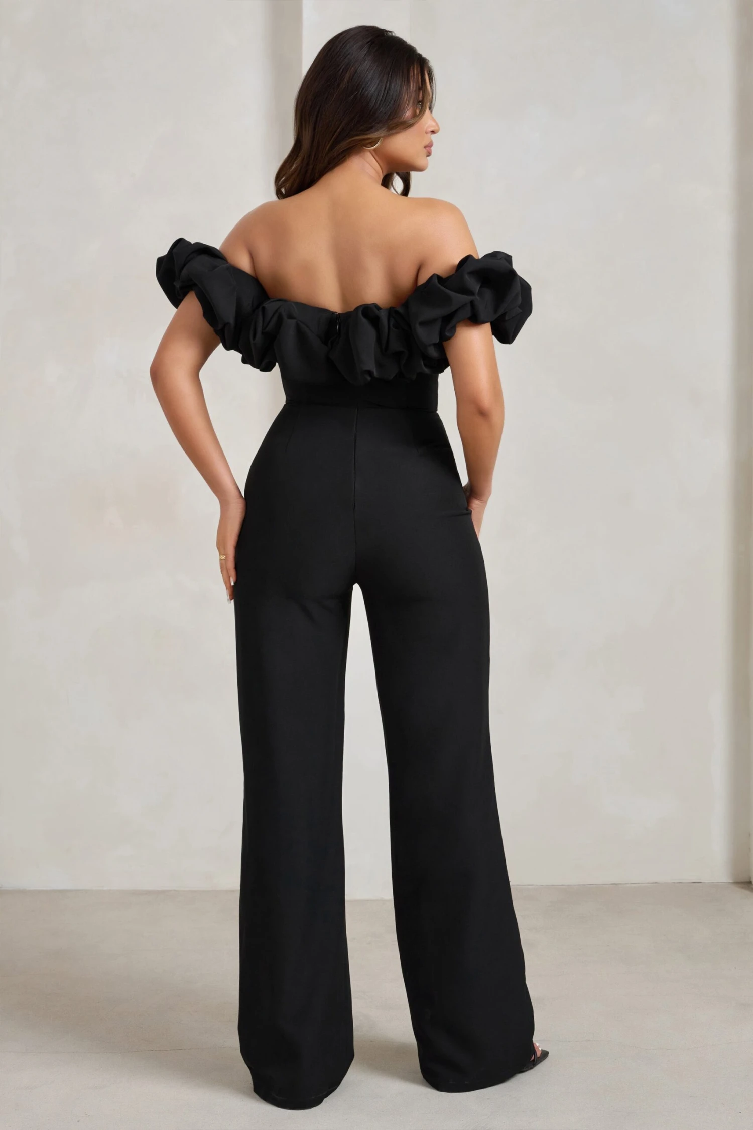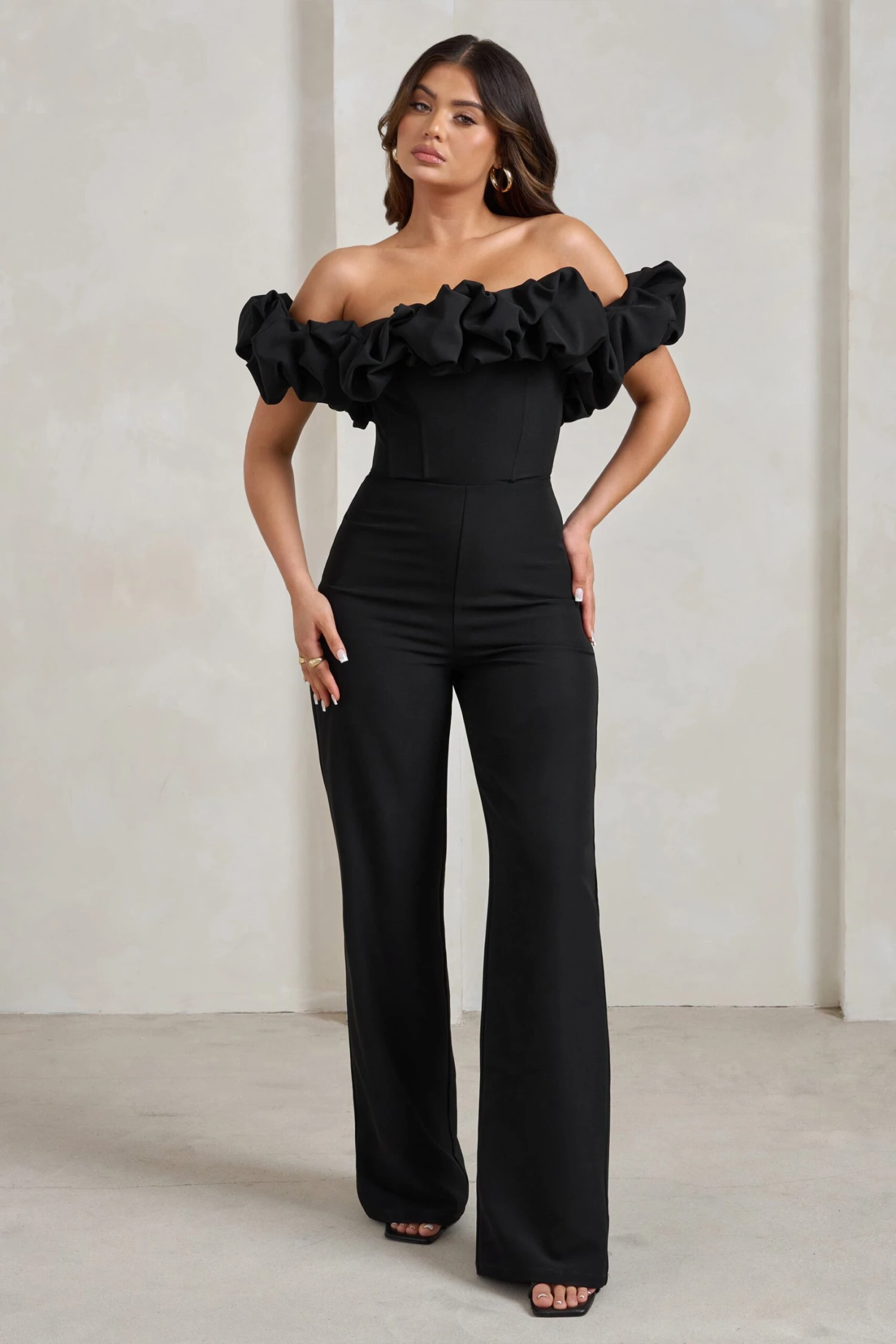 A fine trim of voluminous ruffles makes this short-sleeved jumpsuit truly unforgettable. Perfect for bridesmaids, bachelorettes and birthday girls, our Enchanted boasts a Bardot silhouette made from premium black crepe with boning to define your waistline, sculpting darts and wide yet well-tailored legs.