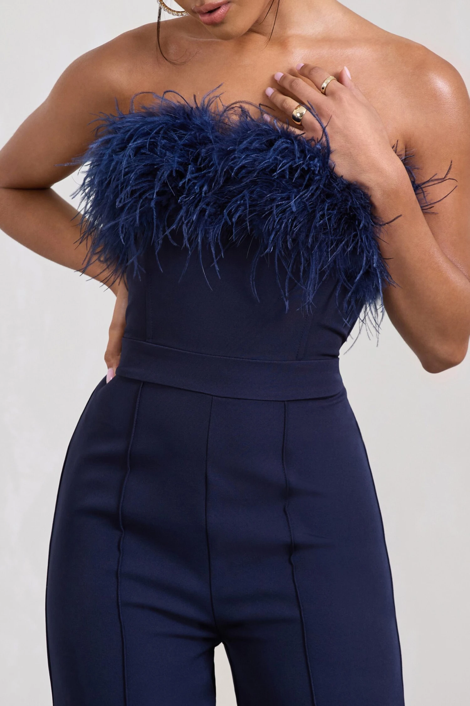 First Class is the feathered showstopper your wardrobe needs for the party season ahead. Designed in sculpting stretch crepe, this navy jumpsuit features a bandeau neckline, bodice boning and long wide legs. Finish First Class with a slick high bun and pointed pumps for an enviable evening look.