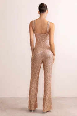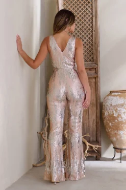 Audrey | Champagne Sequin Cross Front Flared Leg Jumpsuit With Keyhole Detail