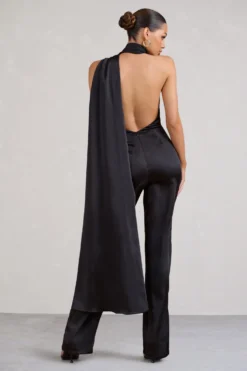 Cascada | Black Satin Wide Leg Jumpsuit With Statement Scarf Neck