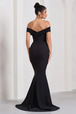 looks stunning from all angles, which means every photo from your big day will be a flattering one. With a backless design, strappy detailing and close-cut hip-hugging fit, this gown is guaranteed to create a classic hourglass silhouette in a stunning black hue. Style it with embellished sandals and a box clutch.