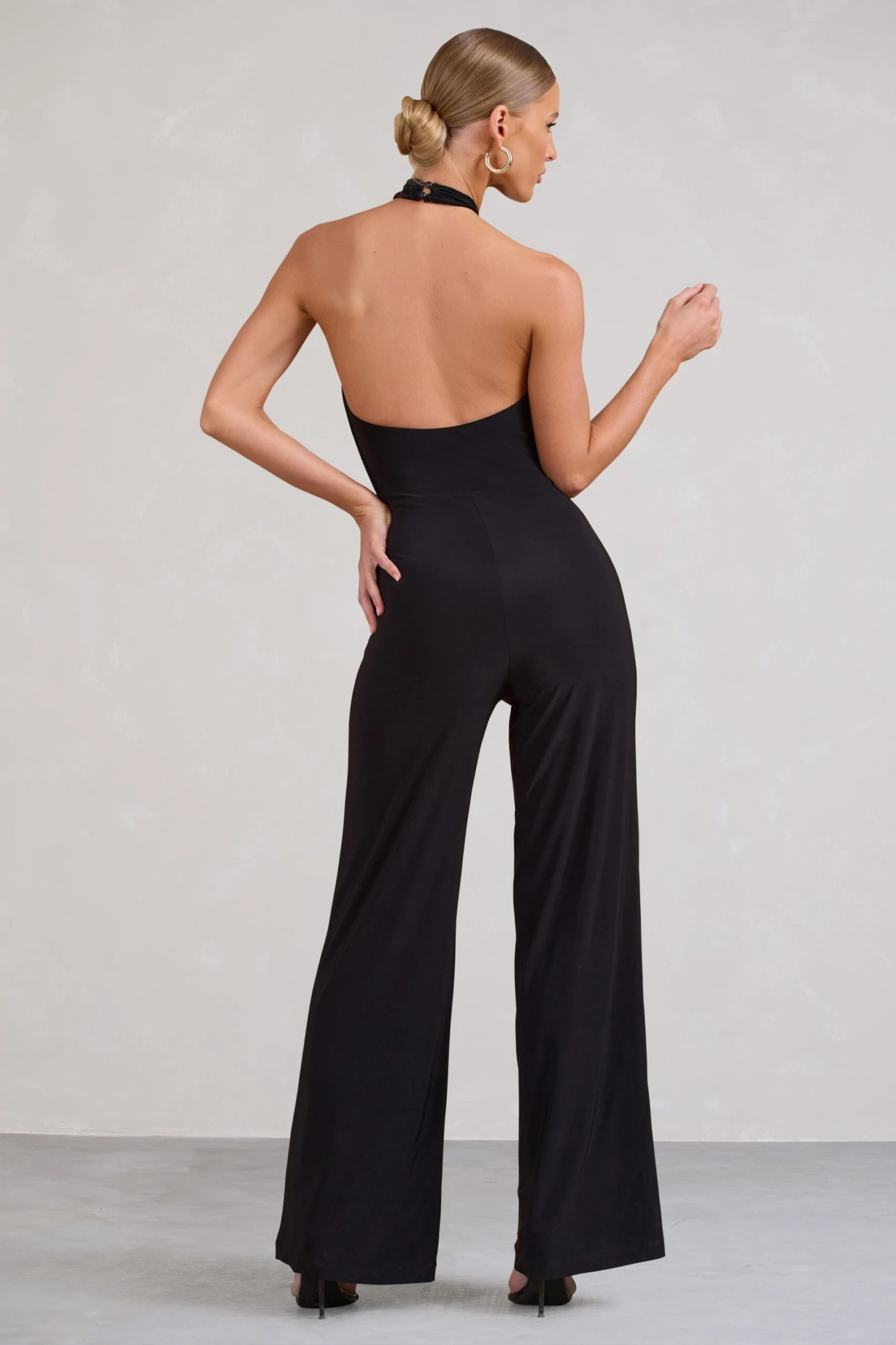 Meet Maddie, the must-have jumpsuit to make you stand out at every social occasion. Designed in our signature stretch jersey known for the ability to flatter every figure, this black jumpsuit features a halter neckline that buttons from behind, an open back and tailored wide legs. Pair Maddie with gold and silver accents for a classic birthday or wedding guest look.