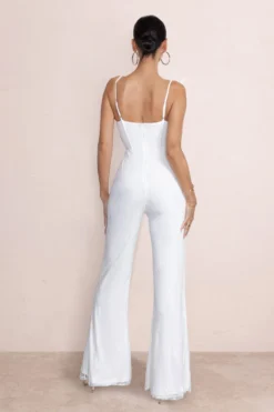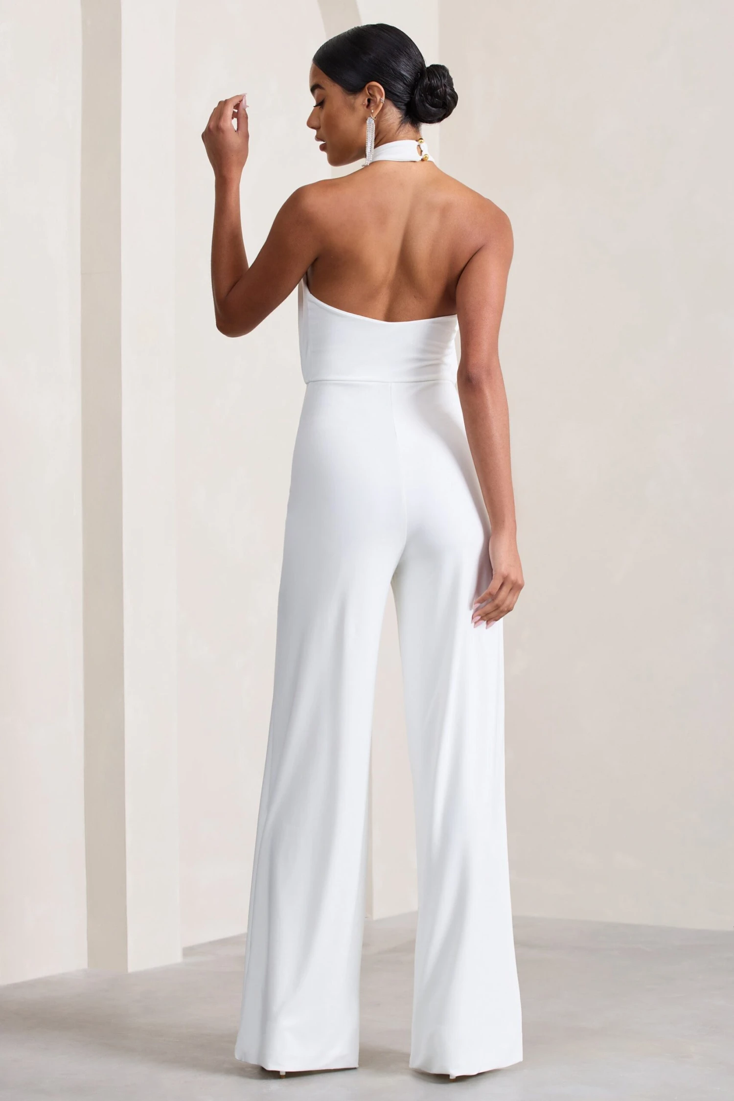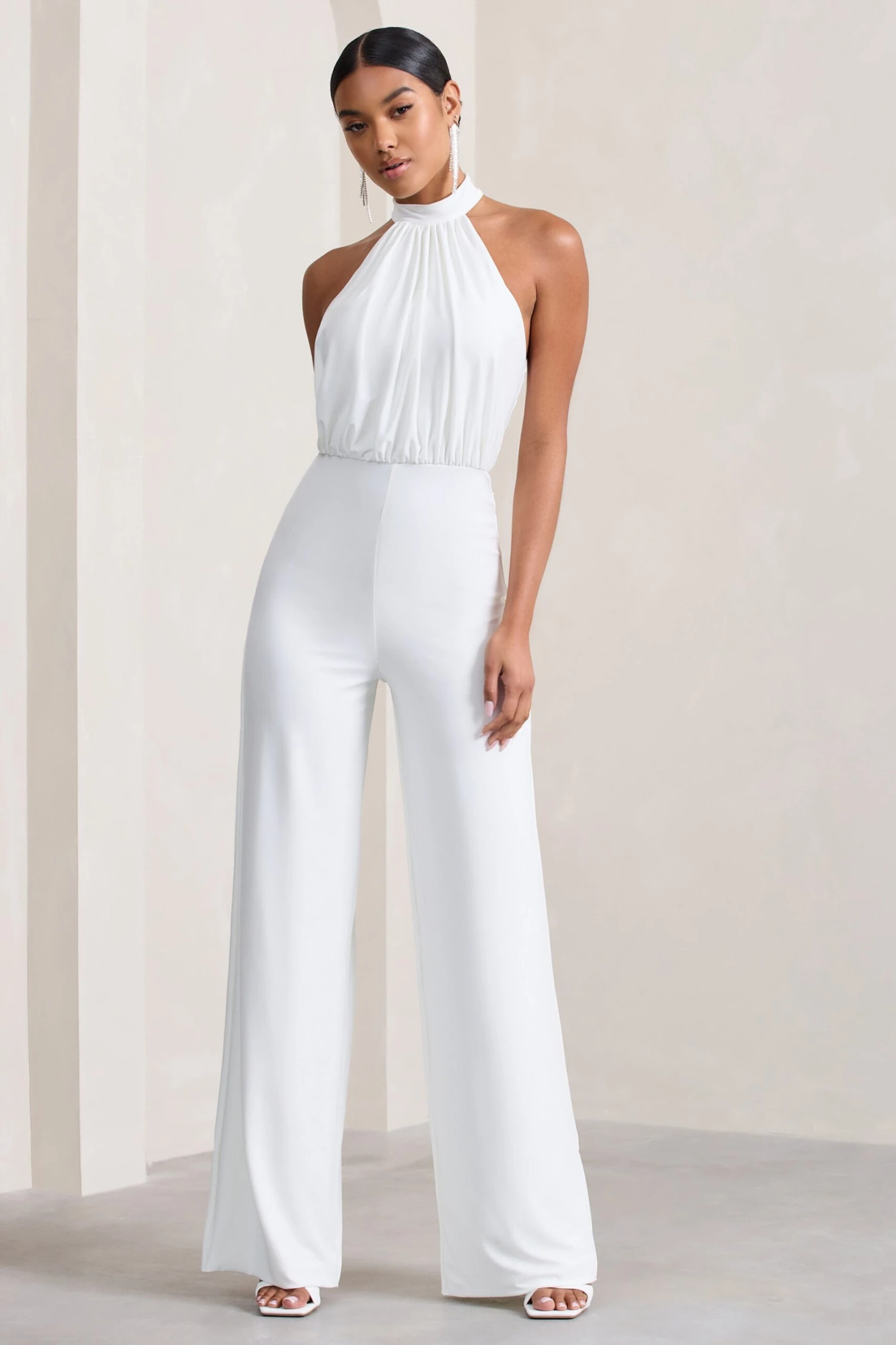 Meet Maddie, the must-have jumpsuit to make you stand out at every social occasion. Designed in our signature stretch jersey known for the ability to flatter every figure, this white jumpsuit features a halter neckline that buttons from behind, an open back and tailored wide legs. Pair Maddie with gold and silver accents for a classic birthday or wedding guest look.