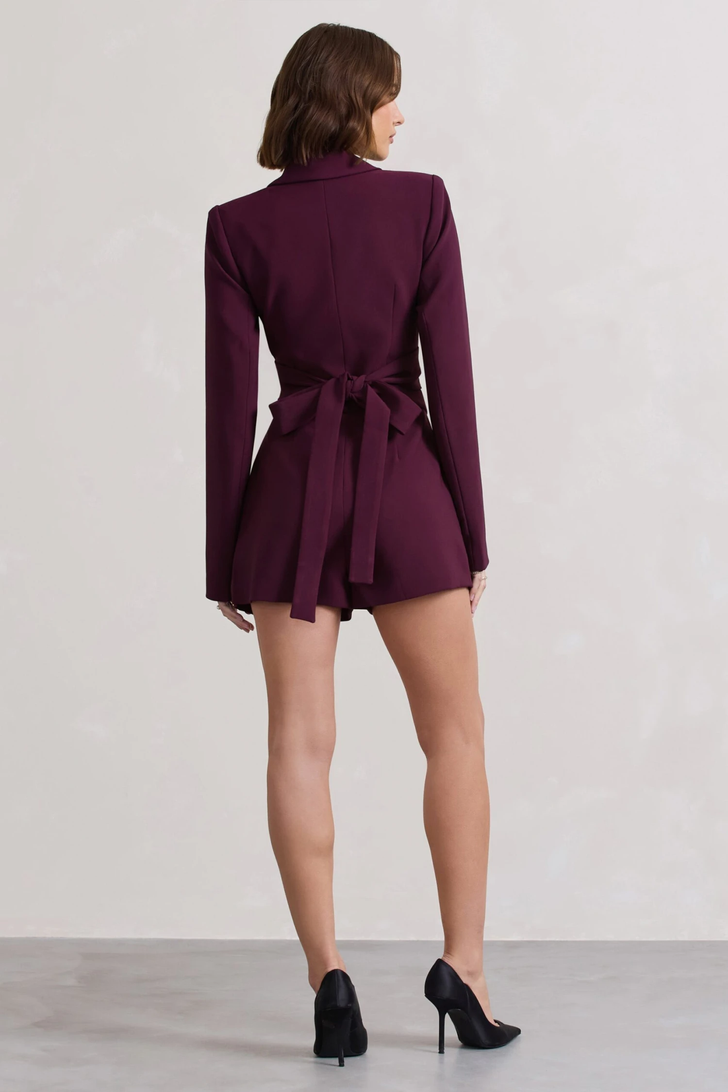 Our latest tailored playsuit Madison is the perfect combination of a classic silhouette with a new season edge. Arriving in a plum shade of a premium stretch crepe, this plunge-neck playsuit features subtle shoulder padding, peak lapels and a waist cinching wrap detail. For an elevated evening look, try styling Madison with a sleek bun and strappy stilettos.