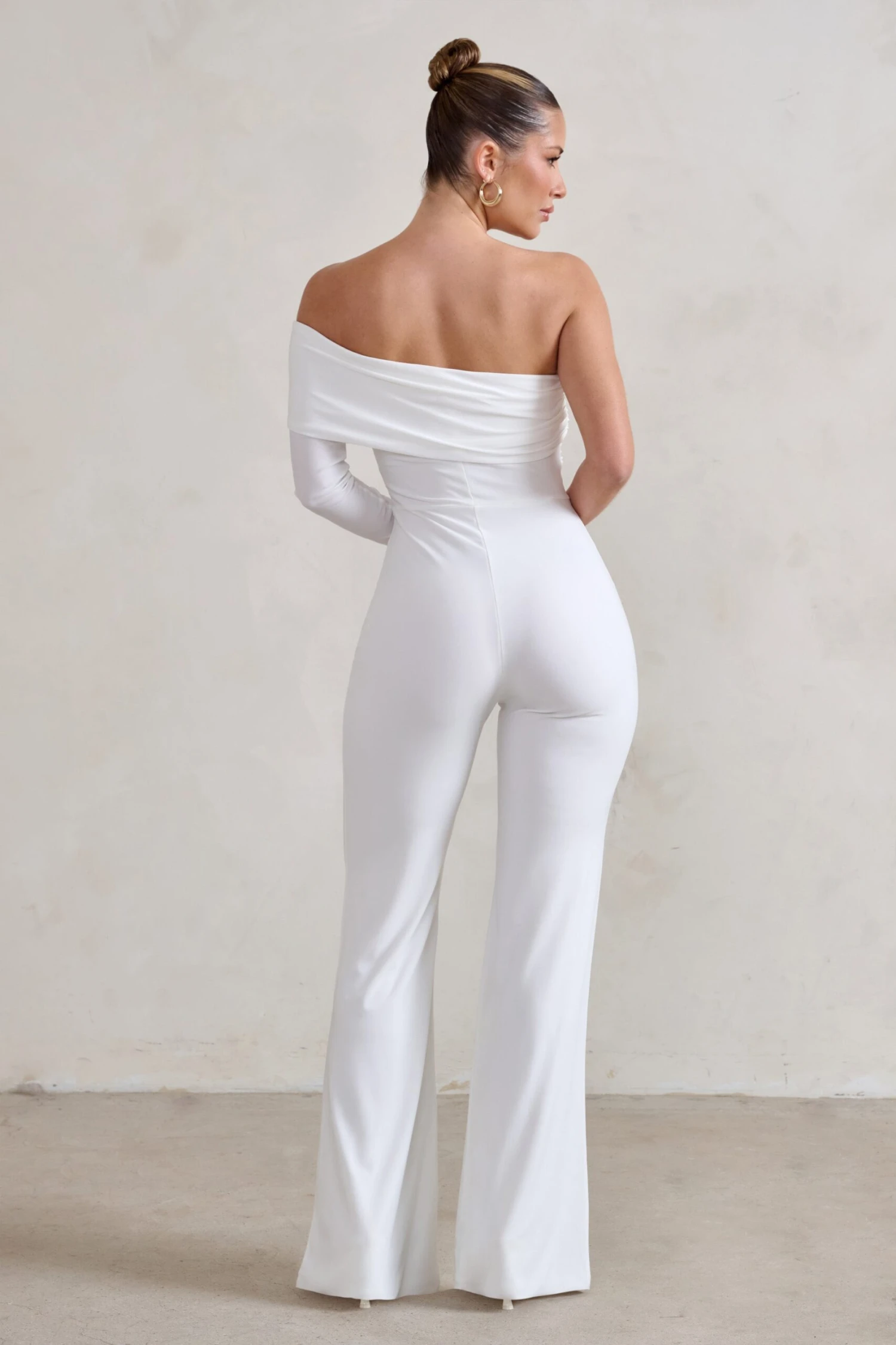 Meet Margie, our asymmetric must-have in a premium white jersey designed to catch every curve on your gorgeous figure. Perfect for daytime drinks or evening events, this fitted formal jumpsuit boasts a Bardot neckline with one long sleeve and wide legs that showcase your legs.