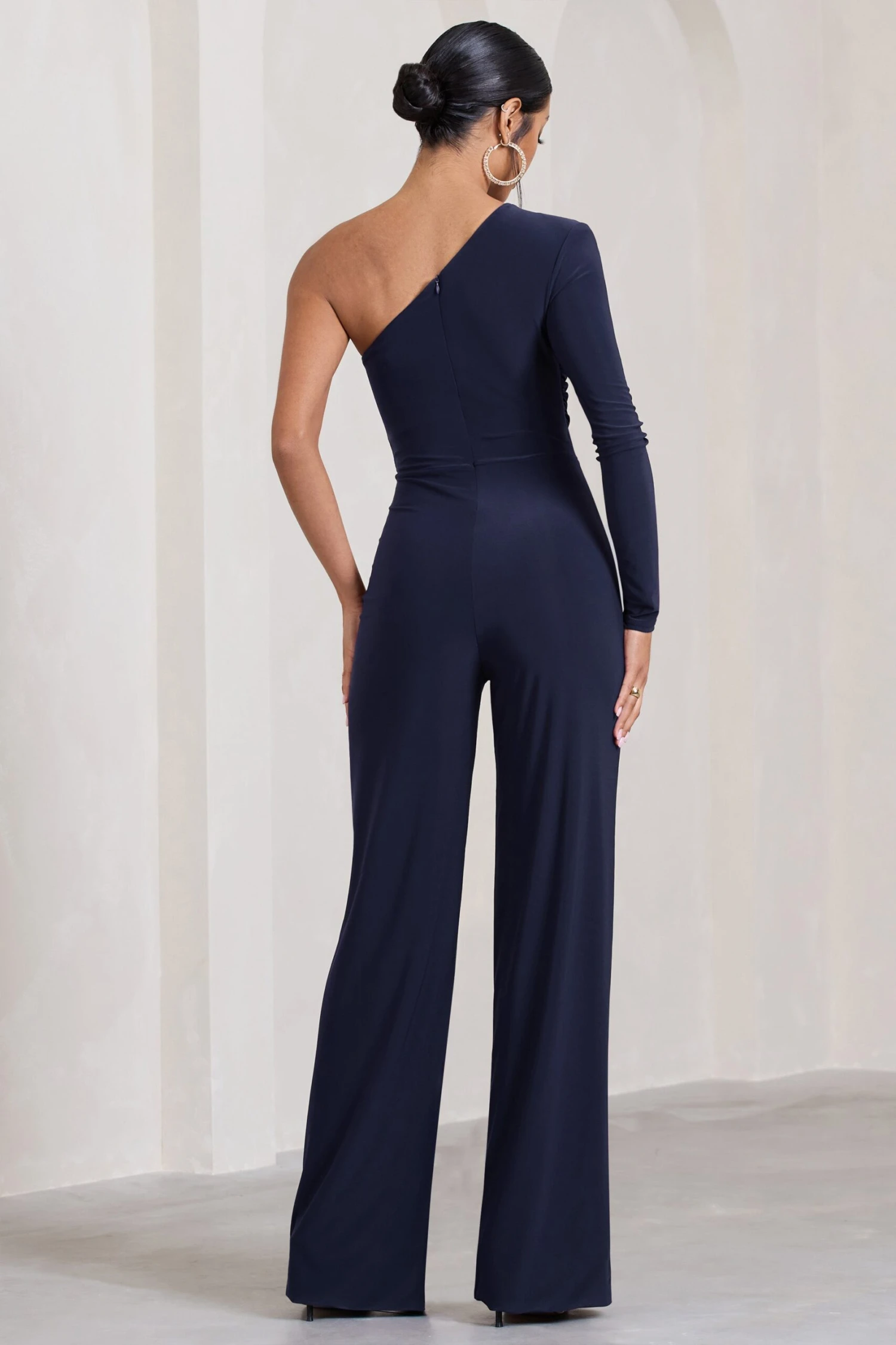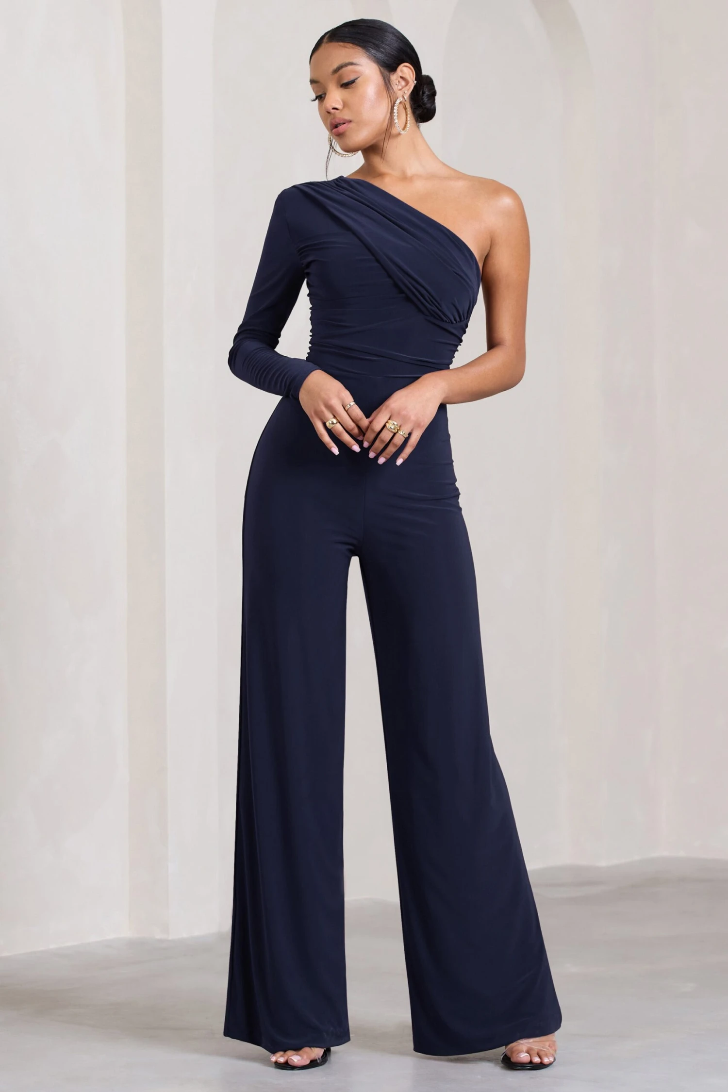 Mila | Navy One Shoulder Ruched Wide Leg Jumpsuit