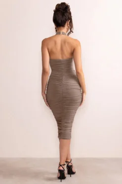 Letitia | Taupe Halter Neck Bodycon Ruched Midi Dress