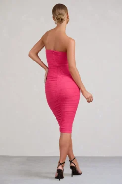 Negroni | Hot Pink Bandeau Corset Ruched Mesh Midi Dress