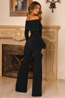 Hand On Heart | Black Twist Front Bardot Long Sleeve Jumpsuit