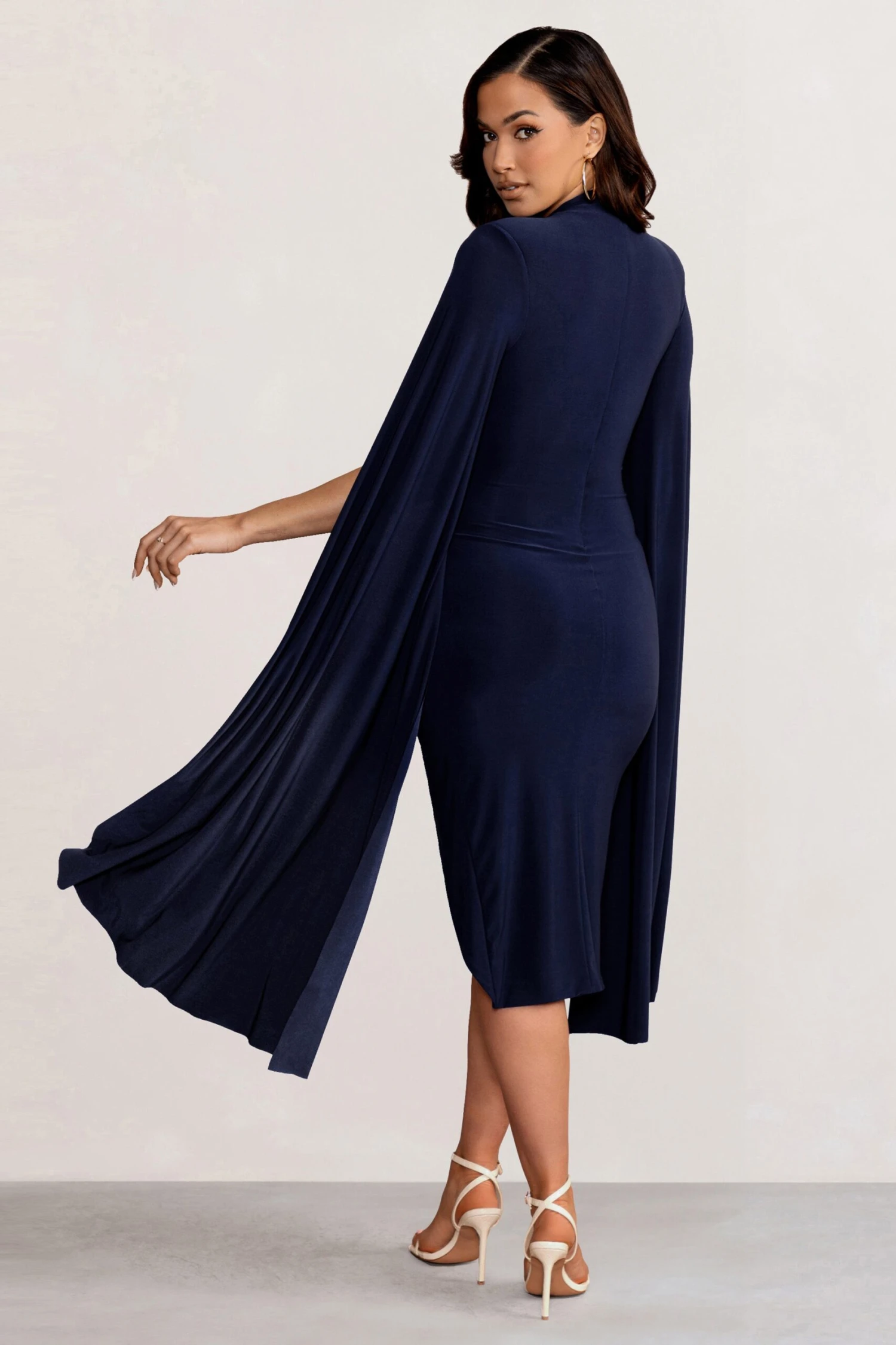 Turn up the glamour in our Sara midi dress. Designed to make a statement with its striking cape sleeves and in a classic navy hue, this dress is a must-have for your next special event. The thigh split is balanced with a demure high neckline while the ruching cinches you in and emphasises your curves. Perfect for a wedding guest look or christening, our Sara midi is the one!