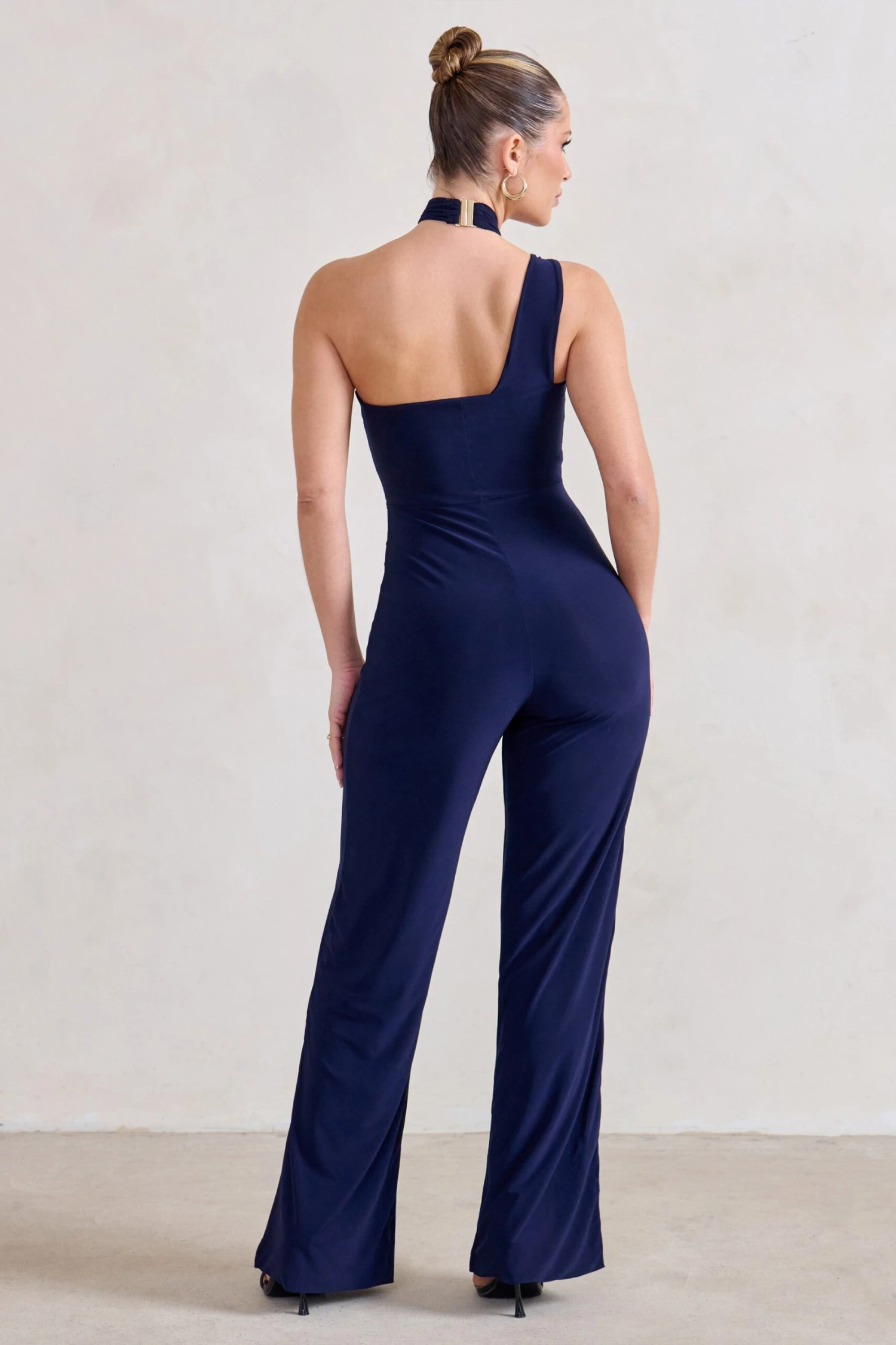 Refresh your wardrobe for every upcoming occasion with our classic and curve-enhancing Tilly jumpsuit in navy. Perfect for weddings, engagements or garden parties, this wide-leg playsuit boasts a statement halter neckline with asymmetric twisting and a subtle hook fastening.