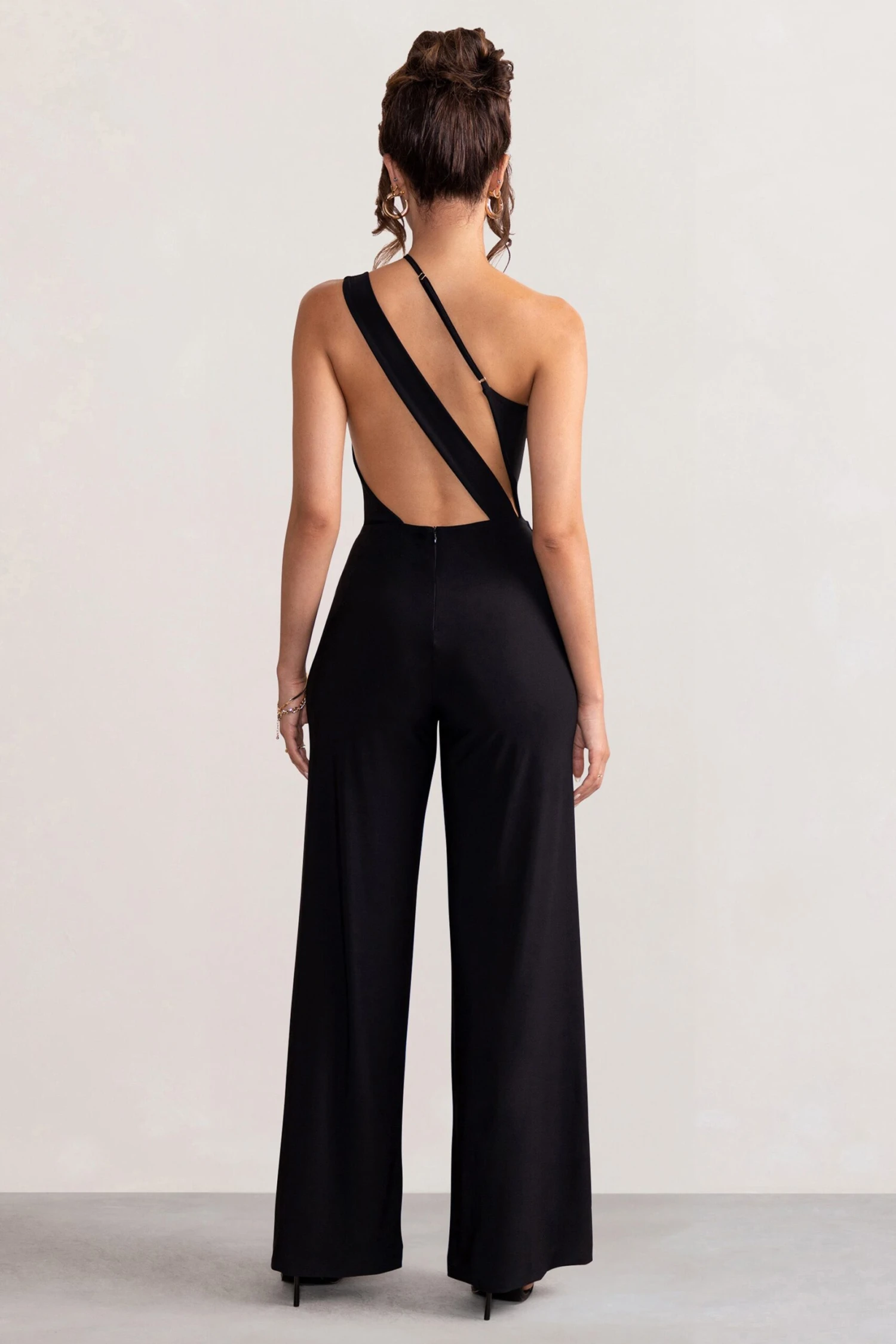 Upgrade your new season wardrobe with our signature Vienna jumpsuit. With a gorgeous asymmetric strap detail that finishes in a glamorous cowl neckline and a super flattering open back design. The wide leg trousers will create an illusion of legs that can go on forever, and the luxe jersey fabrication in a classy black shade will contour your hourglass figure. Make an entrance at your next gala, VIP or black-tie event with this show-stopping look!