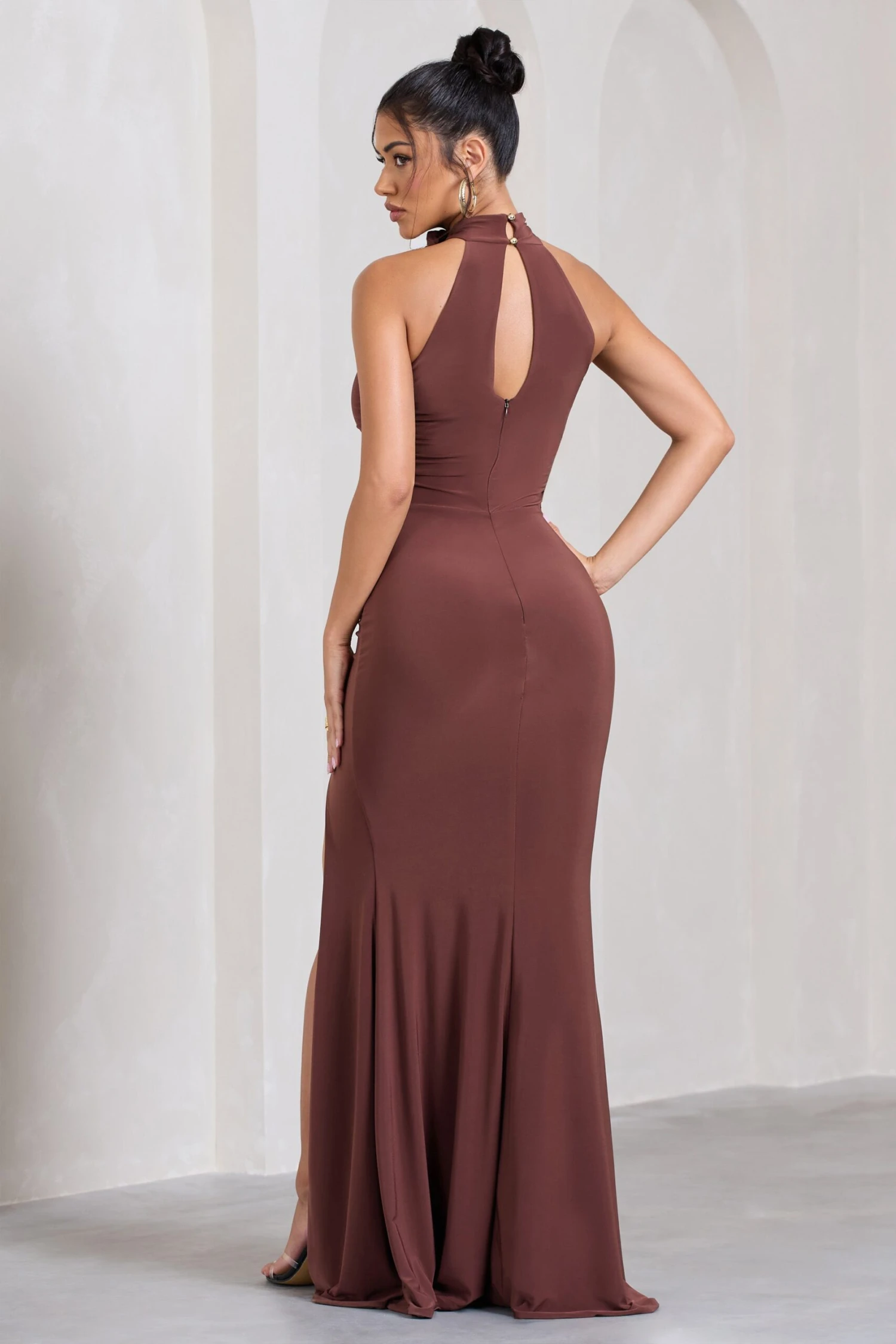 Crafted in a supportive stretch jersey, this sleeveless maxi dress is defined by a flower corsage that falls effortlessly into a delicate display of ruffles. Arriving in a rich chocolate brown shade, Wanderer is finished with a stunning high-leg split. This maxi is a great option for proms, weddings and everything in between.Â